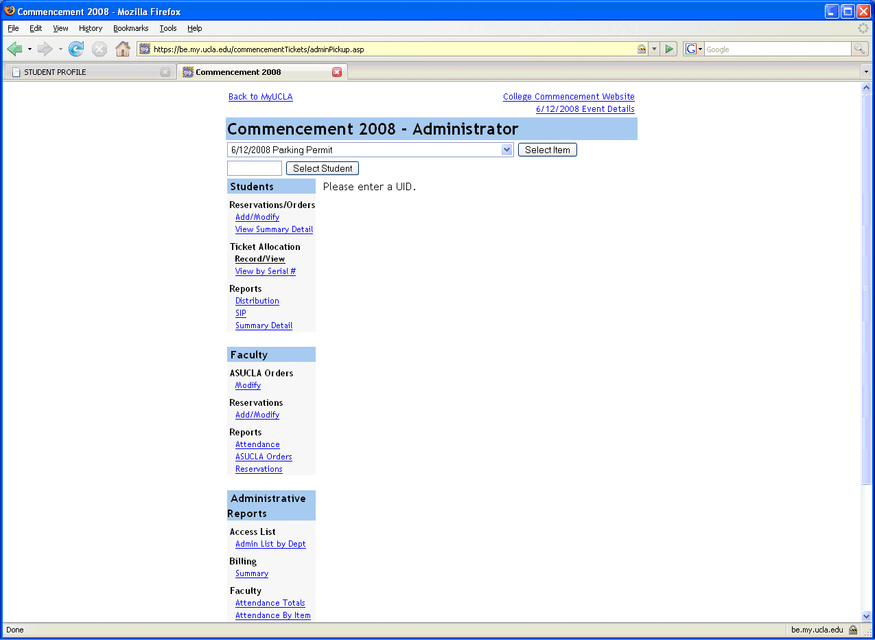 Commencement Administrator ticket pickup: enter UID