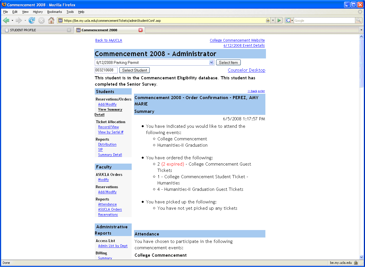 | Commencement Administrator ticket pickup: select quantity | Commencement Administrator ticket serial number lookup » | |