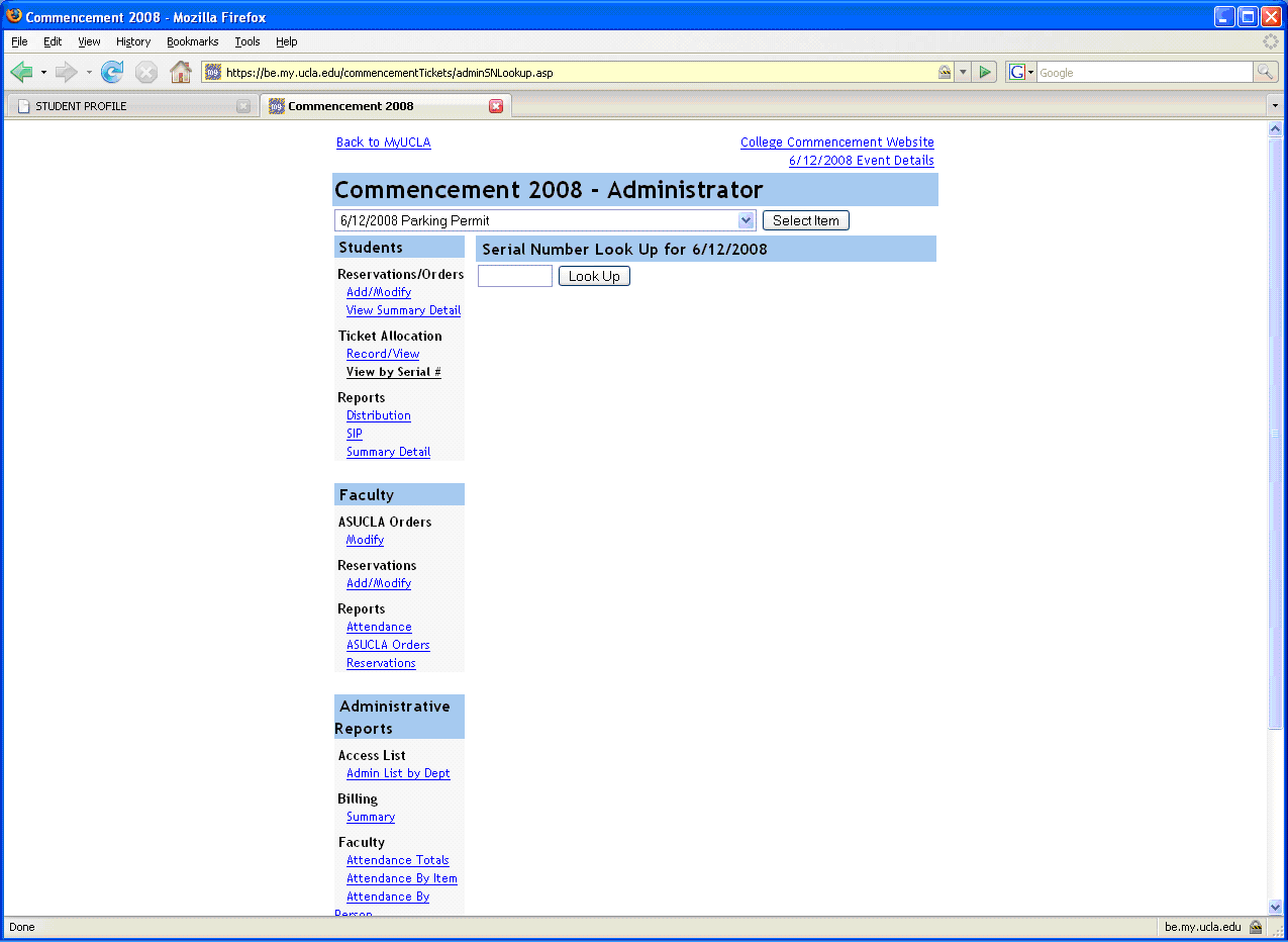 Commencement Administrator ticket serial number lookup